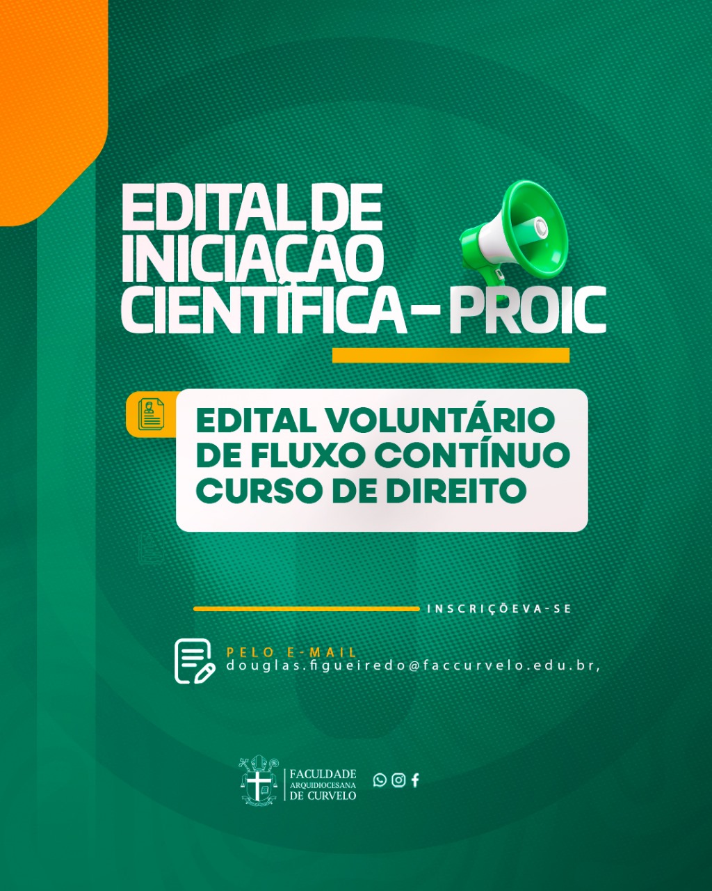 A Coordenação de Pesquisa do Curso de Direito da FAC convida professores orientadores, portadores de título de Especialista, Mestre ou Doutor, e estudantes regularmente matriculados no Curso de Direito a apresentarem propostas de projetos de pesquisa científica, de acordo com o presente Edital do Programa de Iniciação Científica Voluntária – PROIC (fluxo contínuo), para seleção interna de projetos.